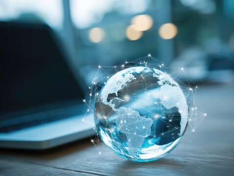 a global data networking internet globe over a laptop global digital technology worldwide business networks online data