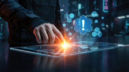 A hand hovers over a keyboard with a bright orange light emanating from it against a background of abstract blue shapes