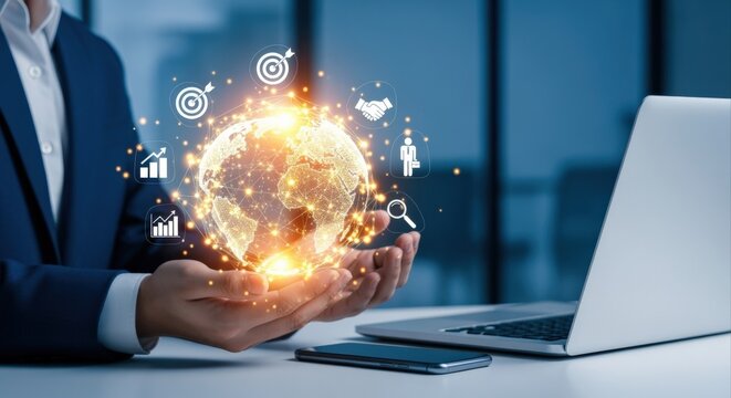 Global Business Connection: Businessman Holding Digital Earth with Icons Representing Strategy, Partnership, and Growth