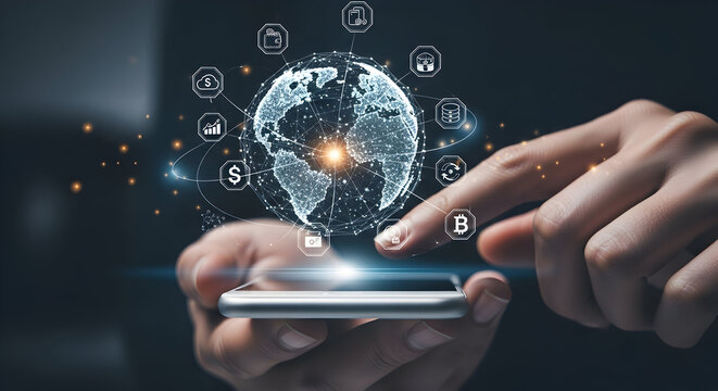 Mobile global internet communications world wide web on phone via wireless satellite network technology smartphone digital connection of all earth holographic abstract interface