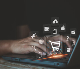 Business people use computer laptop for ordering online shopping on a shopping cart virtual screens. And online payment option or digital wallet online transaction and e-commerce technology concept.