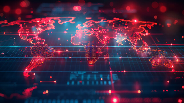 Abstract halftone dots form a world map, symbolizing global connectivity, digital communication, data visualization, and modern technology in a visually striking and conceptual background.