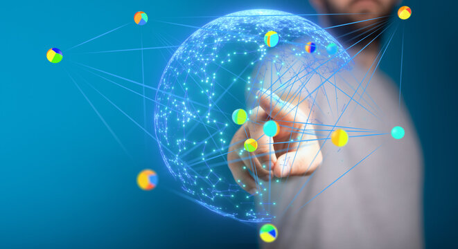 Person interacting with a digital globe, visualizing global network connections and data points.