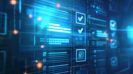 A digital screen with a blue hue displaying compliance guidelines, regulatory policies, and checkbox lists, illustrating proper adherence to standards