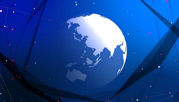 A stylized Earth globe centered on a deep blue background overlaid with a network of dark angular lines and small colored dots
