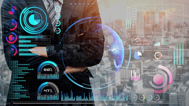 Businessman interacting with futuristic technology interface for global communication and data exchange