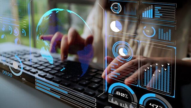 Futuristic digital world map displaying global network data, nodes, analytics dashboard
