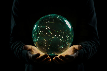Man hands holding global network and data customer connection, Abstract science, on nature background.