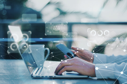 Close up of male hands using laptop and smartphone at desktop with coffee cup and abstract glowing polygonal business chart interface hologram on blurry background. Finance, future and technology .