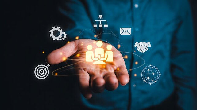 Human hand interacting with a digital interface representing a social network, business network, and communication concept.