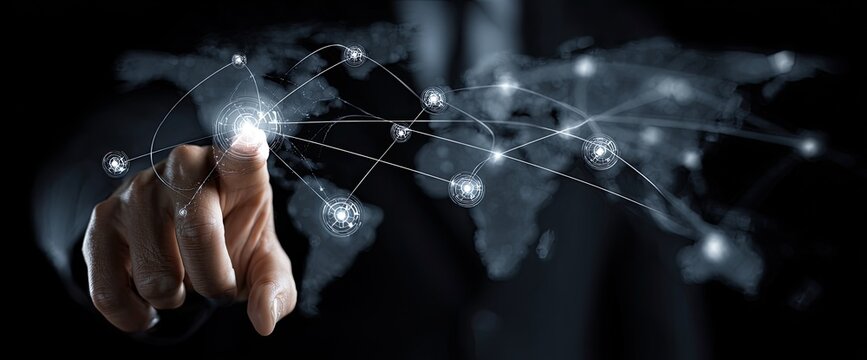 A hand points to a digital world map overlayed with a network of connections, highlighting global interconnectedness in a professional setting.