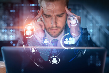 Handsome businessman in suit at workplace working with laptop to hire new employees for international business consulting. HR, social media hologram icons over office background