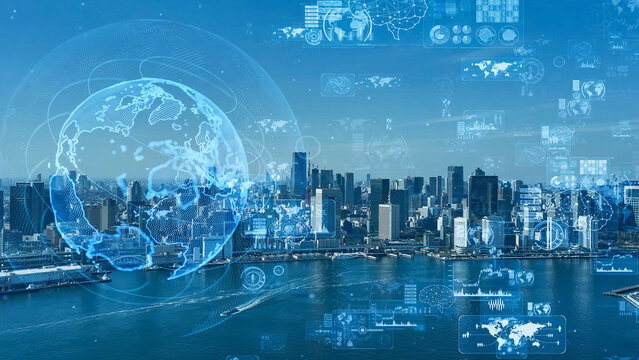 Digital technology, global business network connection, data analysis, social media marketing, digital software development, teamwork and business strategy, internet technology