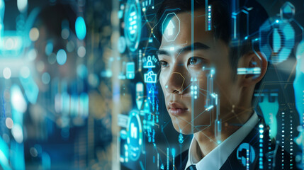 Futuristic concept featuring an Asian model with striking resemblance to a handsome businessman, immersed in the seamless integration of technology within a modern office space