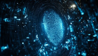 Futuristic glowing digital fingerprint symbolizing secure identity, data protection, and advanced biometric authentication technology