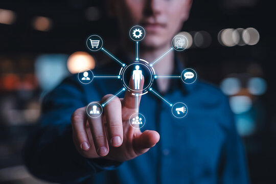 Concept of global digital network with person's hand interacting with interconnected human icons, showcasing technology and social connections.
