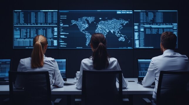 A team of analysts monitors data on multiple screens in a dark environment, focusing on global information systems and analytics.