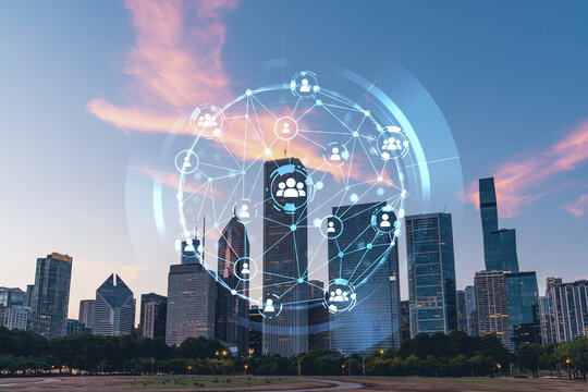Chicago skyline from Butler Field to financial district skyscrapers at sunset, Illinois, USA. Parks and gardens. Social media hologram. Concept of networking and establishing new people connections