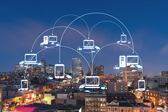 Roof top panoramic city view of San Francisco at night time, midtown skyline, California, United States. Social media hologram. Concept of networking and establishing new people connections