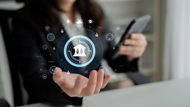A global FinTech and digital banking network technology concept. A central financial system connected to the worldwide digital economy and services. Motif