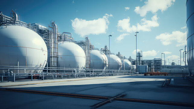 Natural Gas Tank. Large vessels or tanks filled with natural gas at a natural gas processing plant. Bright blue sky, nobody.