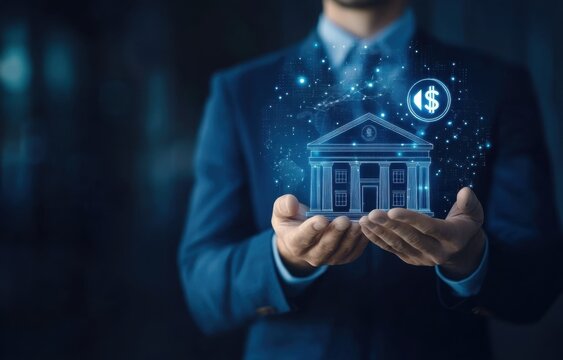 Businessman holding digital bank building (1)