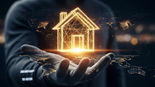 Person holding glowing digital house with modern technology background