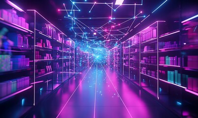 Futuristic data center with advanced digital interface overlay