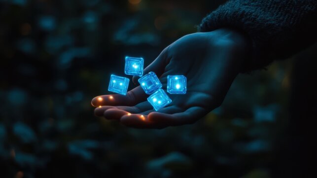 A hand holding glowing blue cubes on a dark background, depicting a technology concept for digital transformation and online business and social media marketing.