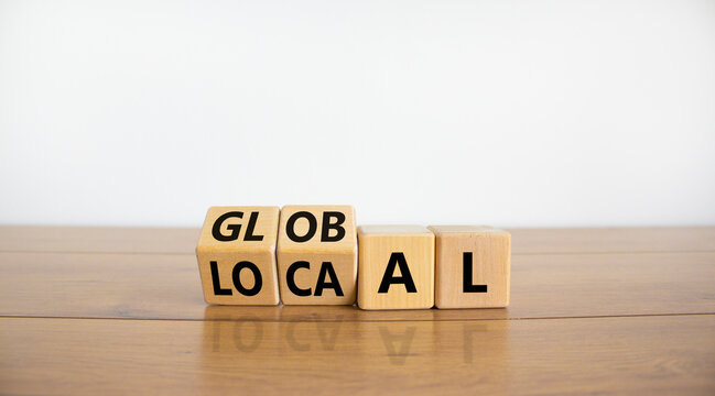 global regional local text quote on wooden signpost outdoors in nature. Blue sky above.