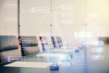 Multi exposure of virtual abstract financial chart hologram and world map on modern corporate office background, research and analytics concept