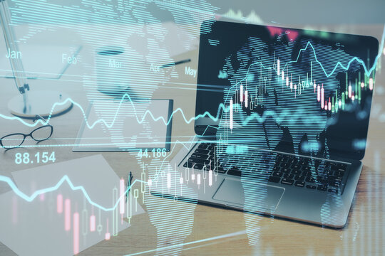 Double exposure of abstract creative financial diagram with world map on computer background, banking and accounting concept