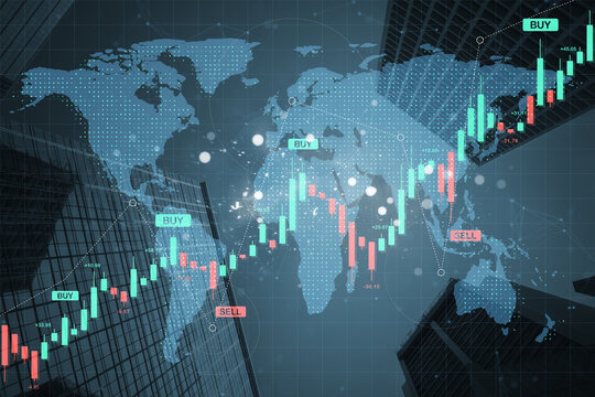 Global financial chart with buy and sell signals over world map and skyscrapers, symbolizing forex trade, investment, and economic growth concept.