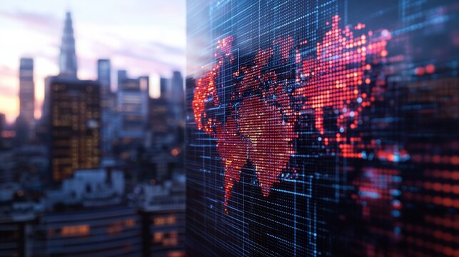 City skyline with world map illustrating global distribution and logistics concept in digital environment