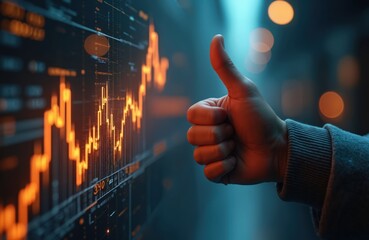 Hand showing thumbs-up gesture near digital graph illuminated with orange lights in futuristic tech setting. Concept of success in trading, investing, global economy and finance.