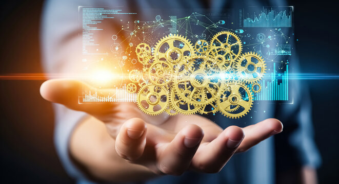 hand holding gears and digital connections, representing the integration between human creativity and AI technology for innovation in business.