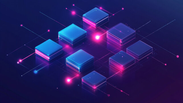 Abstract isometric user interface design with glowing digital blocks on a minimal background, representing business systems, global networks, big data, and smart app concepts in 3D.