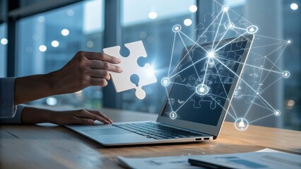 Conceptual visualization of digital integration and problem solving, featuring glowing data networks and gears symbolizing the synergy between human intelligence and modern technology. AI generated