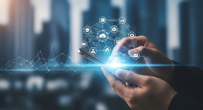 Businessperson using tablet with financial data and digital chart overlay on dark background symbolizing technology-driven business analysis..