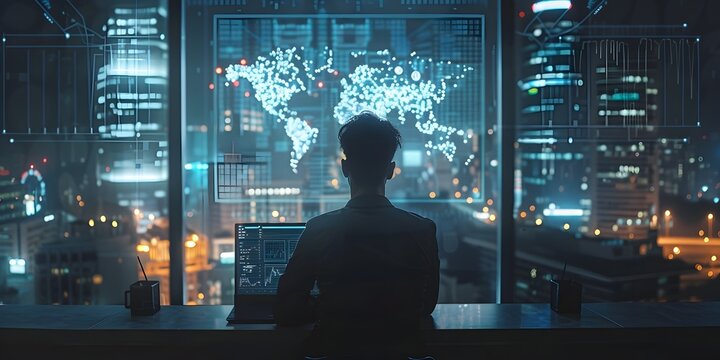 Captivating visualization of a global network featuring data analytics against an urban backdrop, depicting modern economic trends and collaboration in business environments. Xenic