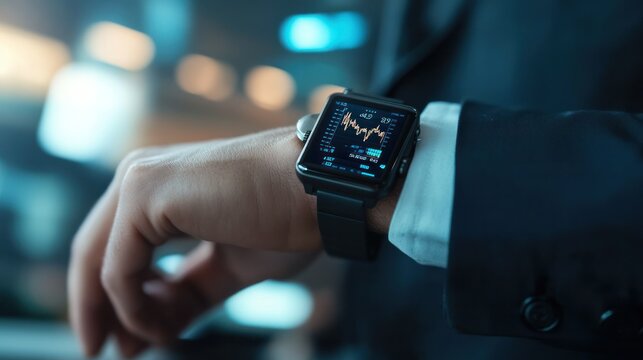Close-up of a smartwatch face showing US market indices, worn by a suited professional against a modern office backdrop