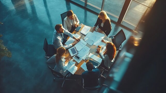 Business people group meeting shot from top view in office  Profession businesswomen businessmen and office workers working in team conference with project planning document on meeting : Generative AI
