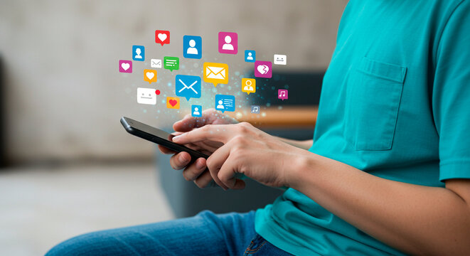 Person's hands interacting with a smartphone displaying various colorful chat bubble and user profile icons, representing online communication, networking, and digital connection