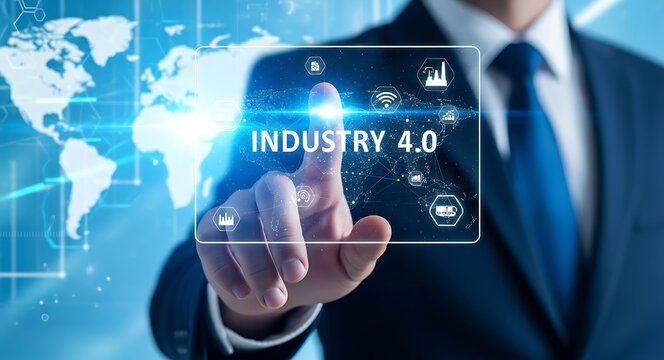 Businessman touching screen displaying INDUSTRY4.0 text and industrial icons INDUSTRY 4.0