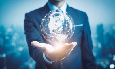 Futuristic global connectivity concept over a misty urban skyline