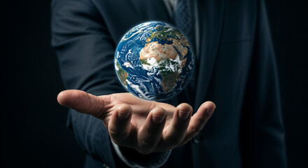 Mysterious figure in dark suit holding glowing Earth symbolizing hidden global power and secret world control from shadows