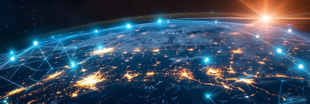Abstract digital world map with glowing lines and nodes representing global connectivity and data flow.