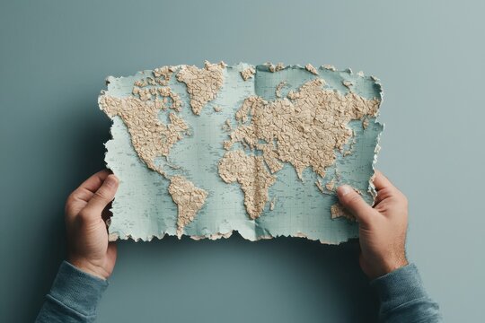 Two hands tear apart a global map signifying the impact of globalization and trade wars