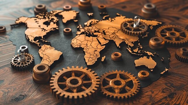 Global collaboration  world map with gears and light bulb symbolizing travel and cooperation