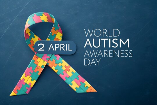 World Autism Awareness Day recognized globally on the second of April featuring a colorful puzzle piece ribbon symbol against a dark blue background